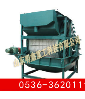 筒體內部裝有鍶鐵氧體****磁系,可促使磁性顆粒迅速吸附到濾布表面,磁濾機主要用于粒度較粗的強磁性礦物精礦礦漿的脫水,由于是上部給料,使得濾餅中精礦按粒度分層的效果更加明顯,當磁性精礦形成濾餅時,顆粒同時受到重力和磁力的作用,粗顆粒精礦比細顆粒精礦向濾布運動的快,精粒首先接觸濾布,故濾餅的透氣性好,而且礦漿中磁性顆粒在磁力吸引下呈放射狀布于圓筒表面,并由于磁系極性變化而產(chǎn)生磁攪動作用,這都成為濾餅易脫水的有利條件,使得濾餅厚且透氣性好,顯著的提高了生產(chǎn)率,與同規(guī)格的筒形真空過濾機相比,其效率提高三倍以上。